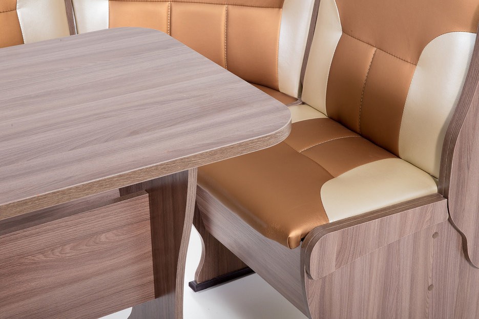 Особенности уголка: Поможет обустроить комфортную обеденную зону без лишних затрат. В гарнитур входит угловой диван, два табурета и раскладной стол. В угловой части дивана есть удобная полочка, на которую можно поставить нужные вещи. Под сидениями находятся вместительные ящики для хранения. Имеет термостойкую пластиковую столешницу. Угол собирается как в правом, так и в левом исполнении. Размеры: Размер угловой скамьи: ш(1080х1080)хг530хв880 мм. Размер стола: ш625(1000)хг580хв750 мм. Размер табурета: ш380хг300хв450 мм. Высота уголка: 880 мм. Высота посадки скамьи: 465 мм. Высота табурета: 450 мм. Высота стола: 750 мм.