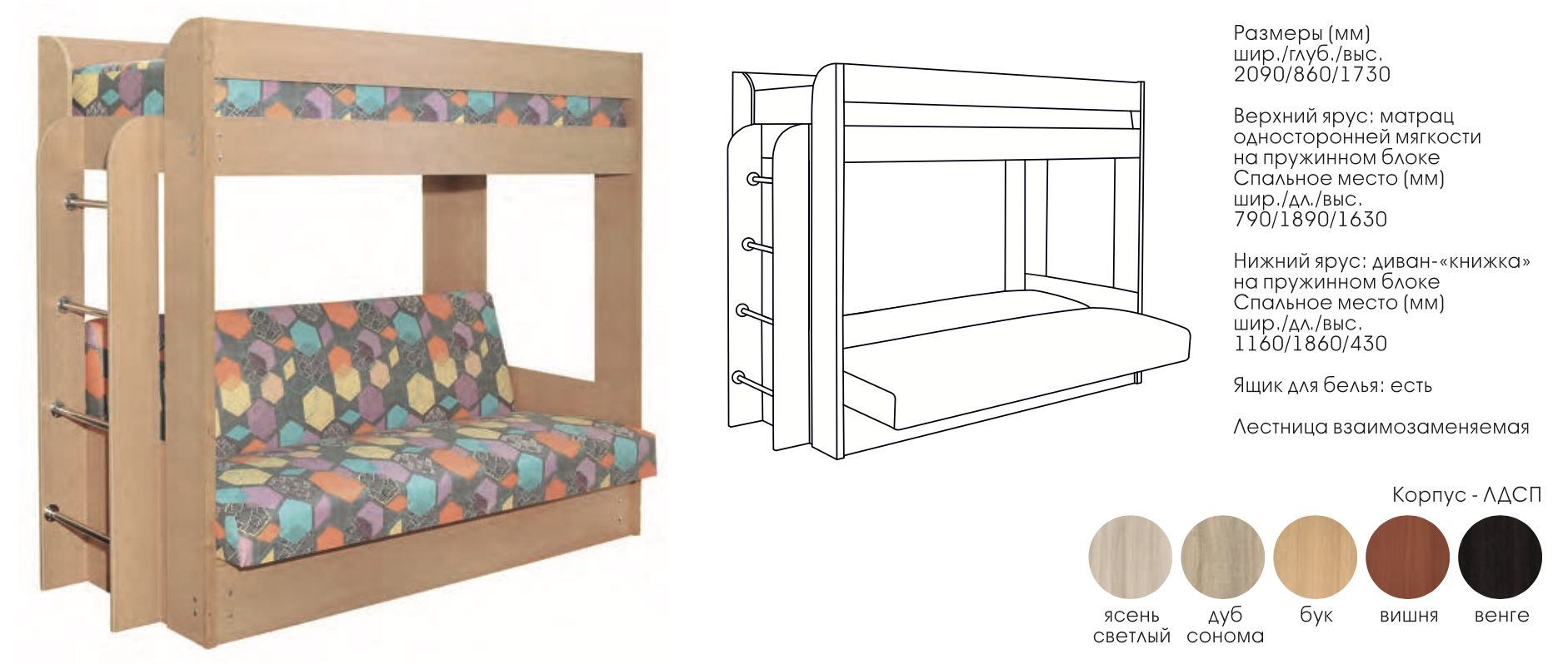 • Нижний Ярус: Диван-Книжка на пружинном блоке /Спальное место: Ширина 1160 х Длина 1860 х Высота 430 мм